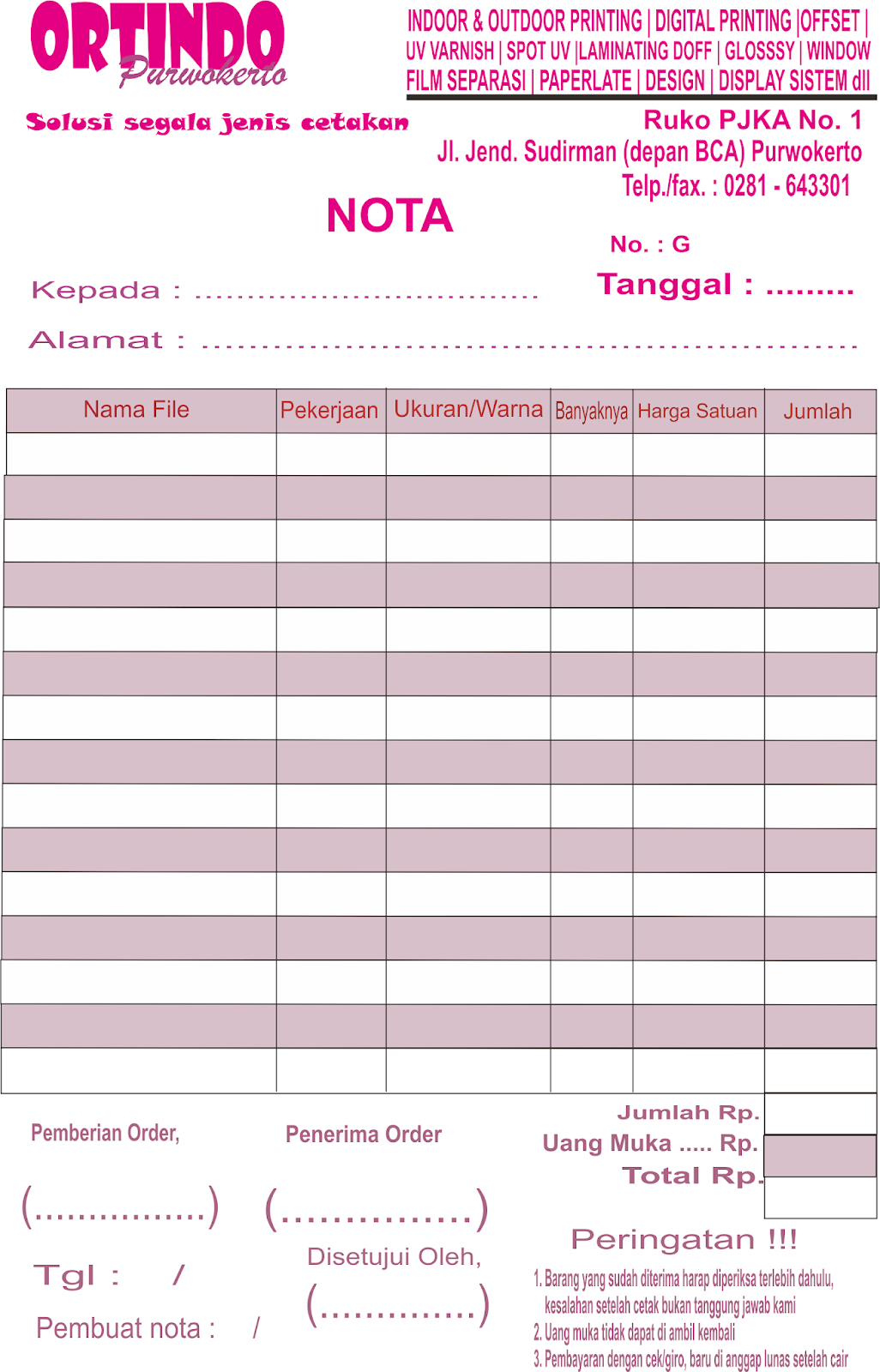 270.000 kalau 2 warna rp. Laporan akhir tahun program pengembangan destinasi pariwisata kegiatan pengembangan obyek pariwisata unggulan pemantauan dan evaluasi pelaksanaan program pengembangan destinasi pemasaran pariwisata pemeliharaan rutin/berkala sarana dan prasarana obyek wisata dinas kebudayaan dan pariwisata kabupaten bantul Nota adalah tanda bukti yang umum digunakan saat adanya transaksi antara pihak pembeli dan penjual. Pilihlah satu yang sesuai dengan gaya desain ruang anda. Didalam pembuatan nota penjualan atau pembelian maka harus terdapat logo perusahaan , jenis usaha, banyaknya, keterangan, harga satu, jumlah dan.