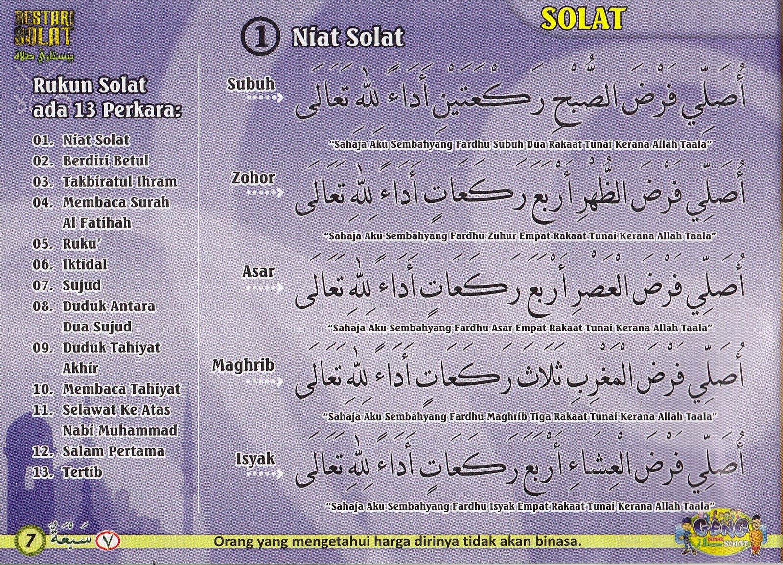 Aku niat melakukan sholat fardu isya 4 rakaat, sambil menghadap qiblat, saat ini, karena allah ta�ala niat sholat diatas adalah niat.