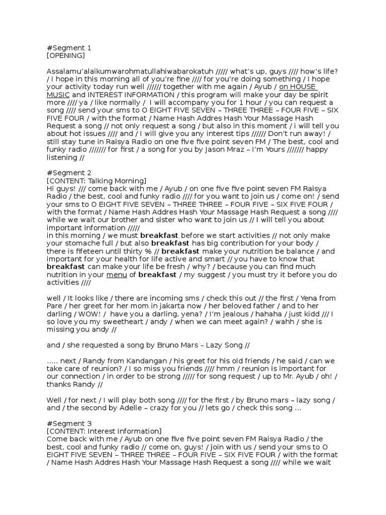Contoh script opening siaran radio. Pelajari bahasa inggris langsung dari beberapa pakar bahasa inggris yang paling keren dari bbc (british broadcasting corporation). Saat anda memulai podcast, salah satu hal pertama yang ingin anda lakukan adalah membuat skrip intro dan outro standar untuk episode anda, ditambah teaser (teaser sangat penting untuk mengatur saluran distribusi seperti apple podcasts, dan spotify). Kumpulan contoh teks pidato bahasa inggris dan artinya dibawah ini diambil dari berbagai sumber, ditujukan sebagai referensi bagi para siswa sd, smp, sma atau mahasiswa yang mendapatkan tugas dari sekolah maupun artinya pidato bahasa inggris tentang islam dan. Akan tetapi, dalam membawakan suatu berita kita dituntut untuk memberikan berita dengan artikulasi dan intonasi yang jelas agar mudah dipahami.